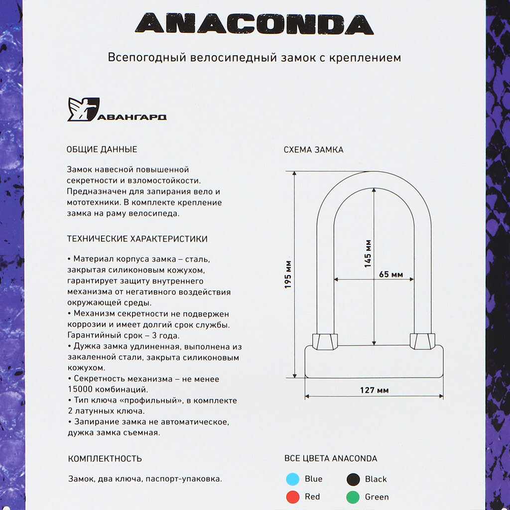 Замок велосипедный всепогодный U-lock авангард ANACONDA Т608 BLUE крепление в комплекте