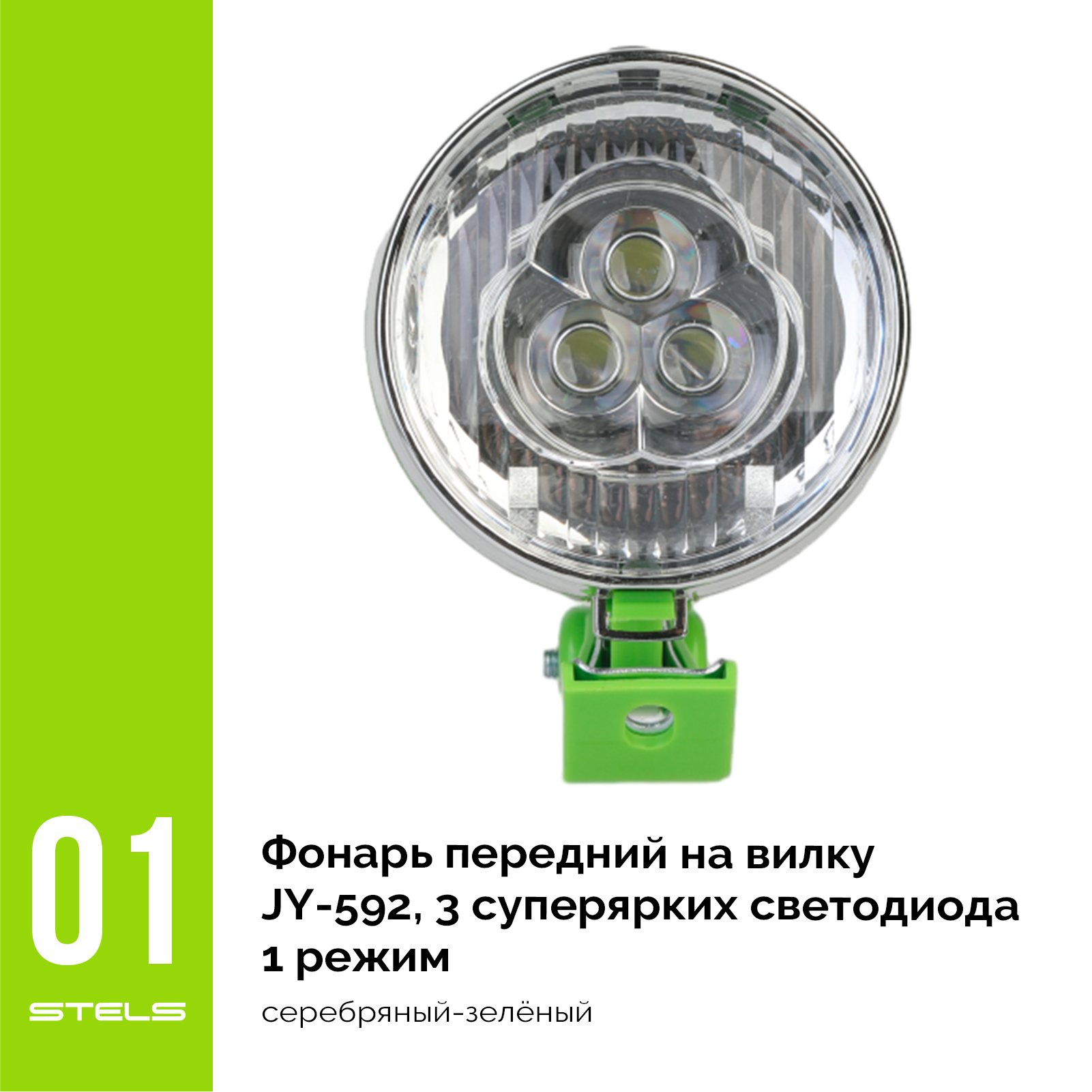 Фонарь передний на вилку JY-592, 3 суперярких светодиода, 1 режим, серебр.-зелёный VELOSALE (item:030)