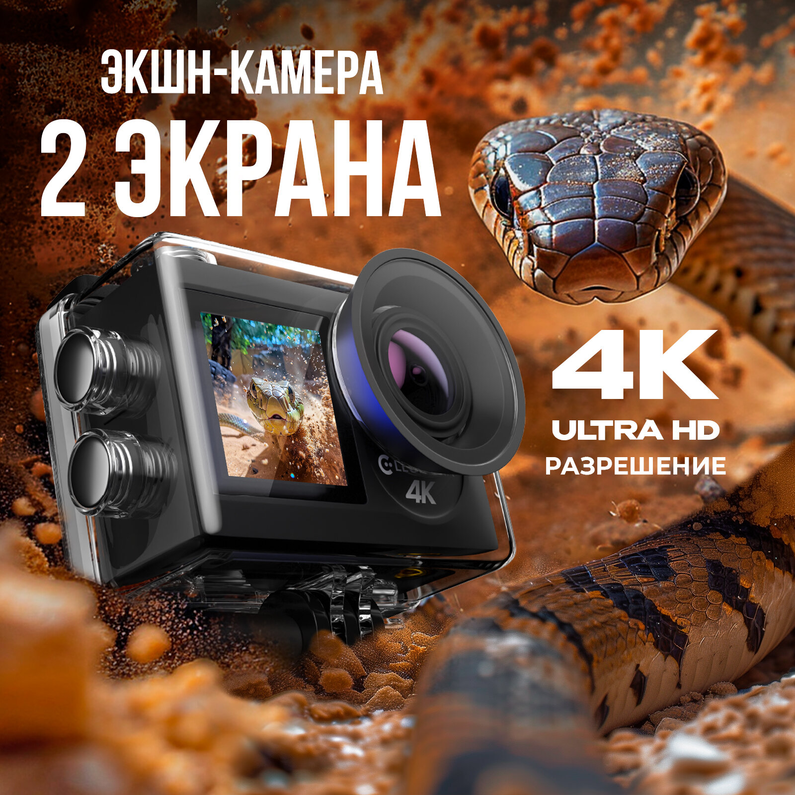 Купить Экшн камера 4К, 2 экрана, водонепроницаемый кейс, крепления. Экшен камера с 2 экранами Electerra. Водонепроницаемый бокс, крепления в комплекте.