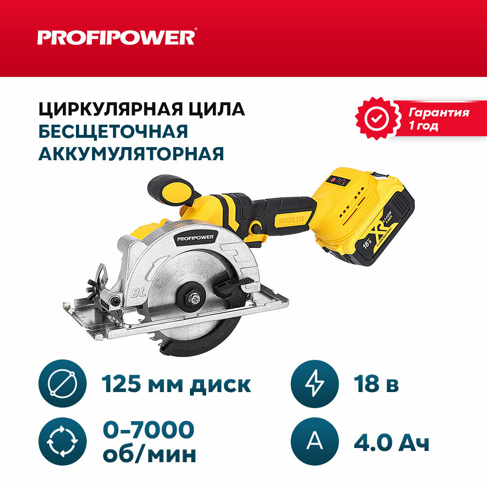 Купить ProfiPower Аккумуляторная пила циркулярная бесщеточная ProfiPower DHS-18V (Li-ion-1шт, 4.0Ач,125мм,