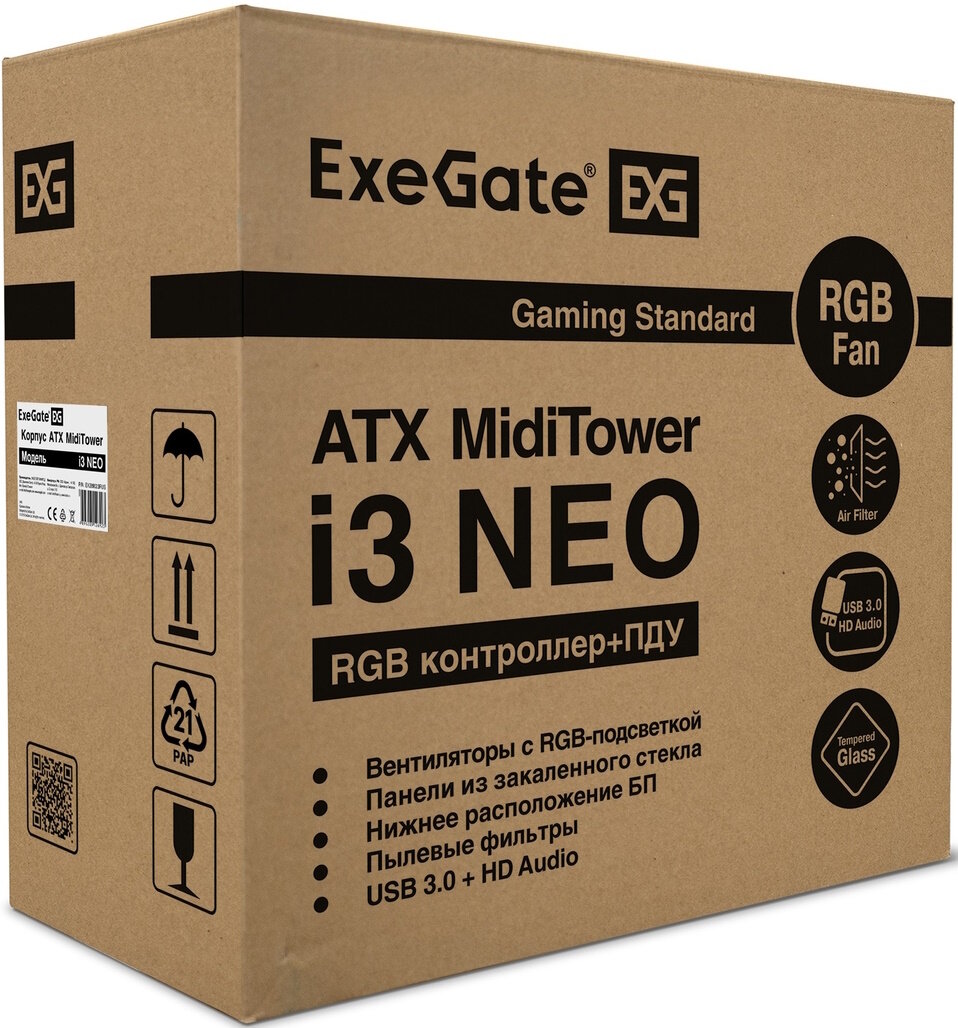 EX290164RUS, Корпус Miditower ExeGate i3 NEO-NPX700 (ATX, NPX700 12см, 2*USB+1*USB3.0, HD аудио, черный, 3 вент. 12см с RGB подсветкой, конт