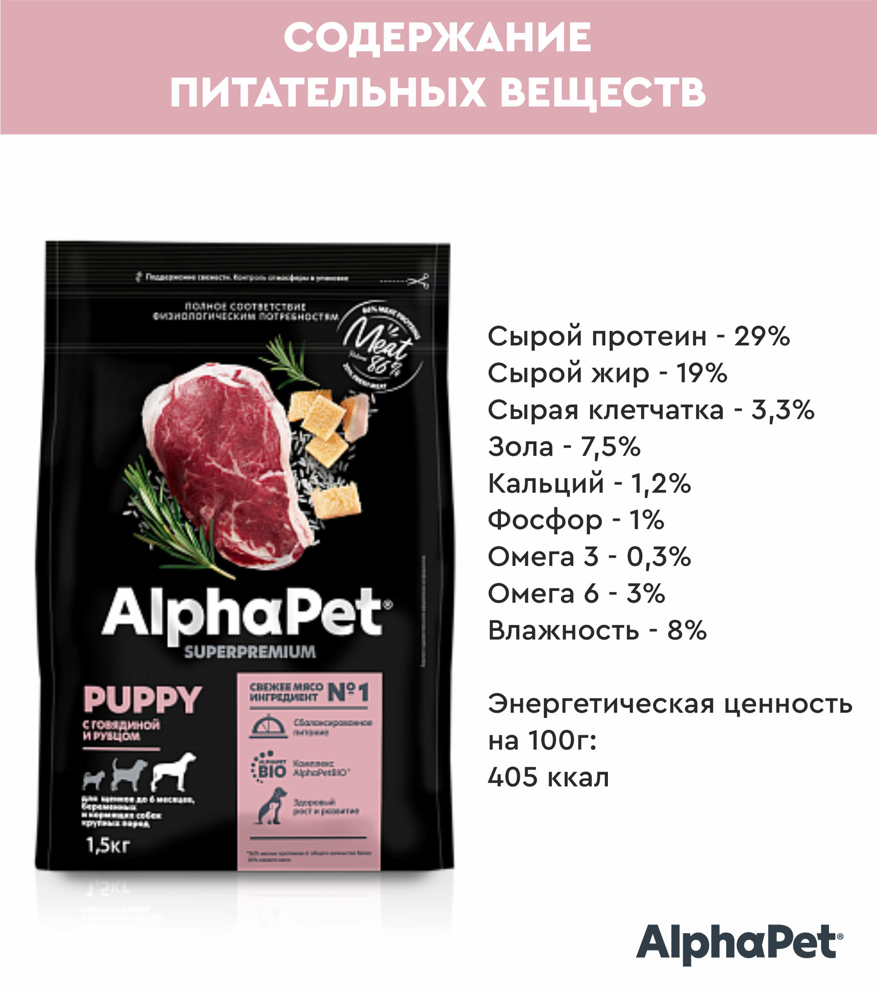 Сухой корм для щенков, беременных и кормящих собак мелких пород ALPHAPET Puppy Superpremium с ягненком и индейкой 1,5кг