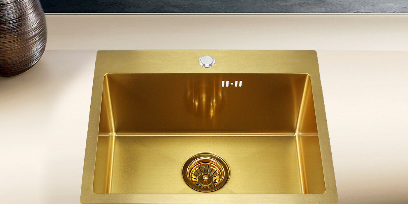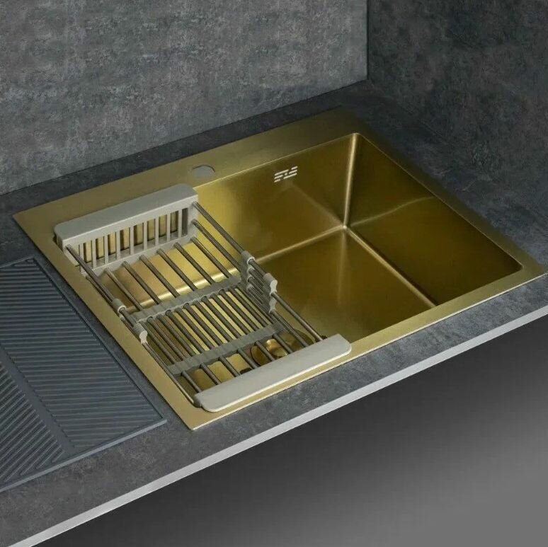 Купить Мойка врезная 60х50 см, золото, толщина 3,0 х 1 мм, глубина 200 мм + большой сифон с переливом + корзина