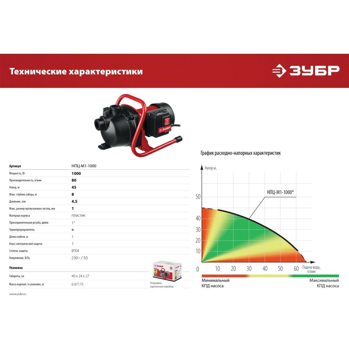 Поверхностный насос Зубр НПЦ-М1-1000 (1000 Вт, 4.8 куб.м/ч, 45 м)