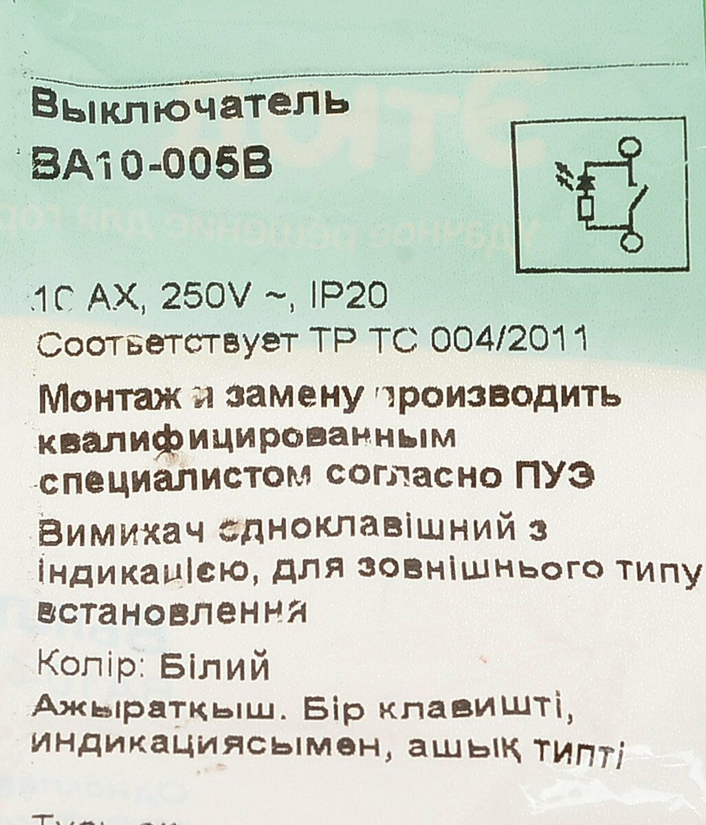 | Комплектация | в сборе с корпусом / выключатель в сборе / Выключатель одноклавишный / 1 клавишный открытой установки установки 10А/250В подсветка белый ЭТЮД |
