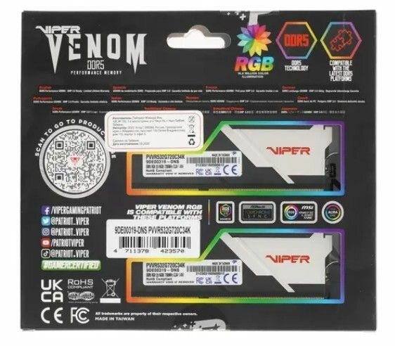 Модуль памяти Patriot Dimm Venom 32GB 7200MHZ RGB Pvvr532g720c34k Pvvr532g720c34k .