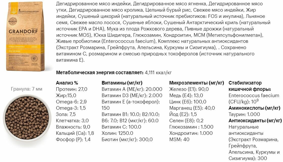 Корм сухой GRANDORF 4 Мяса для собак мини пород от 1 года. 3 кг С пробиотиками, гипоаллергенный.