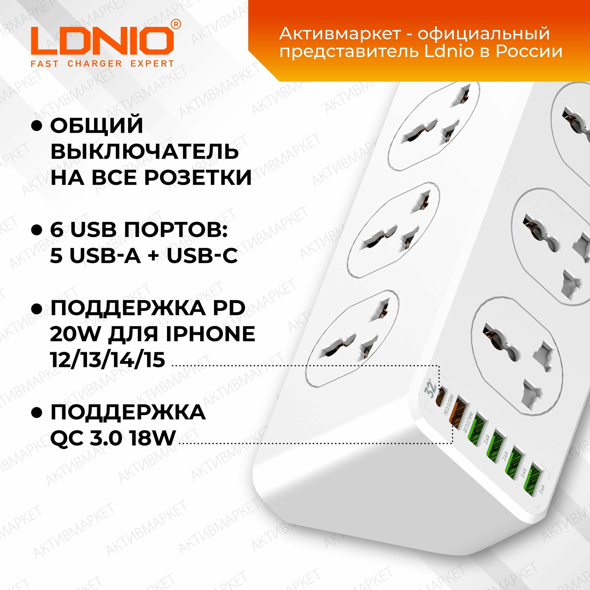 Сетевой фильтр удлинитель 2 метра LDNIO SC10610,10 розеток 2500W + 5xUSB-A+1xUSB-C 30W. Быстрая зарядка интересное: