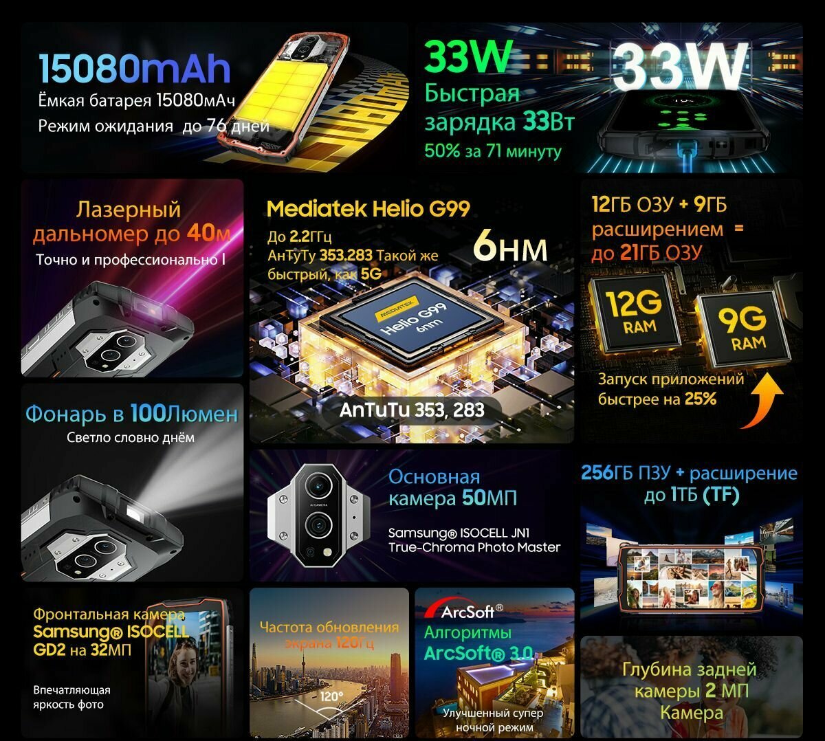 Смартфон Blackview BV9300 с фонариком 12/256 ГБ, оранжевый