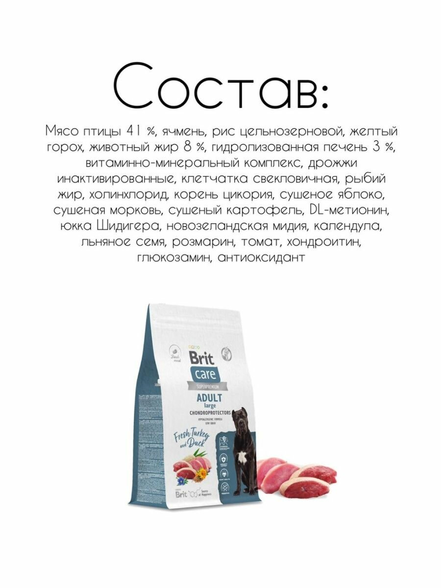 Сухой корм для взрослых собак крупных пород супер-премиум с индейкой и уткой "Dog Adult Large Chondroprotectors" 12 кг BRIT CARE