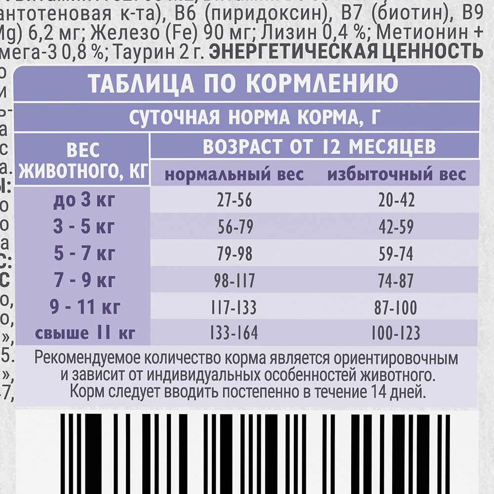 | Дозировка | вес кошки 2-3кг - 30-46 г/день вес кошки 3-5 кг -46-67 г/день вес кошки 5-7 кг - 67-80 г/день вес кошки 8-10 кг - 91-114 г/день |