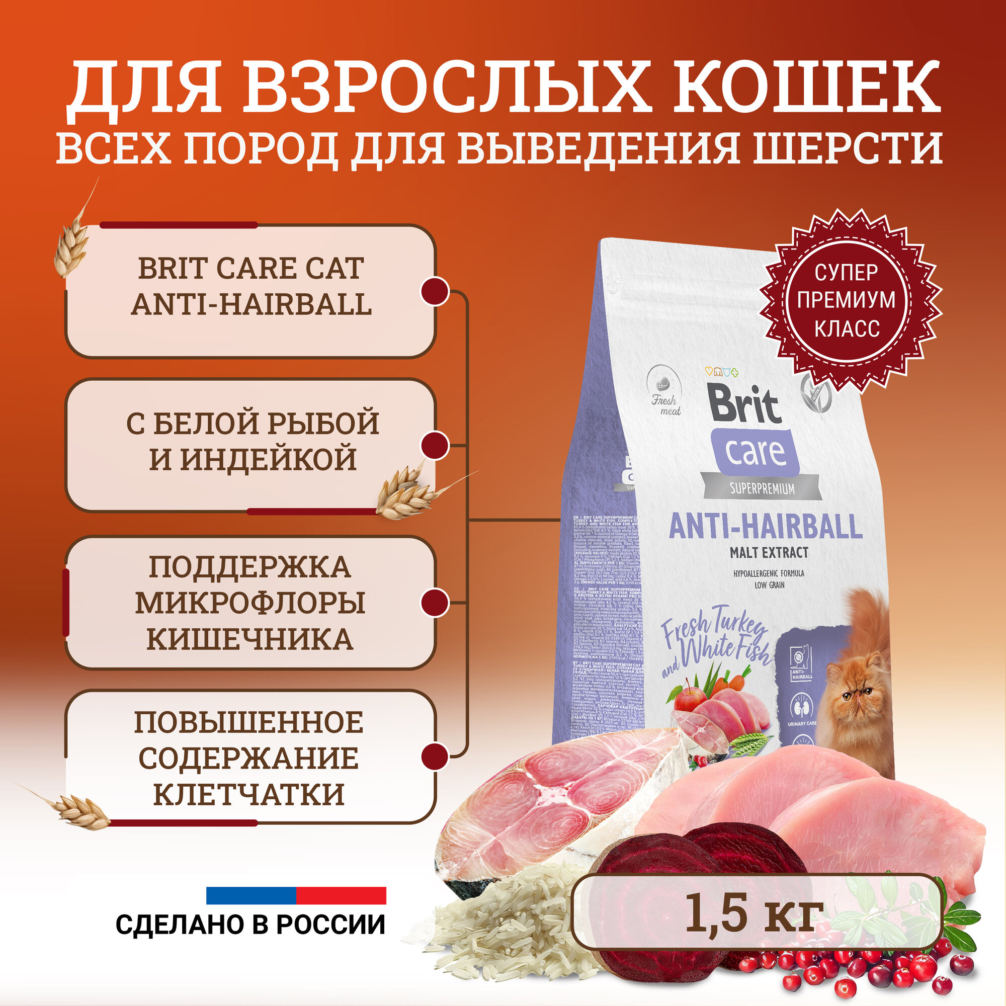 Сухой корм BRIT CARE Cat Anti-Hairball супер-премиум с белой рыбой и индейкой для взрослых кошек 1,5 кг