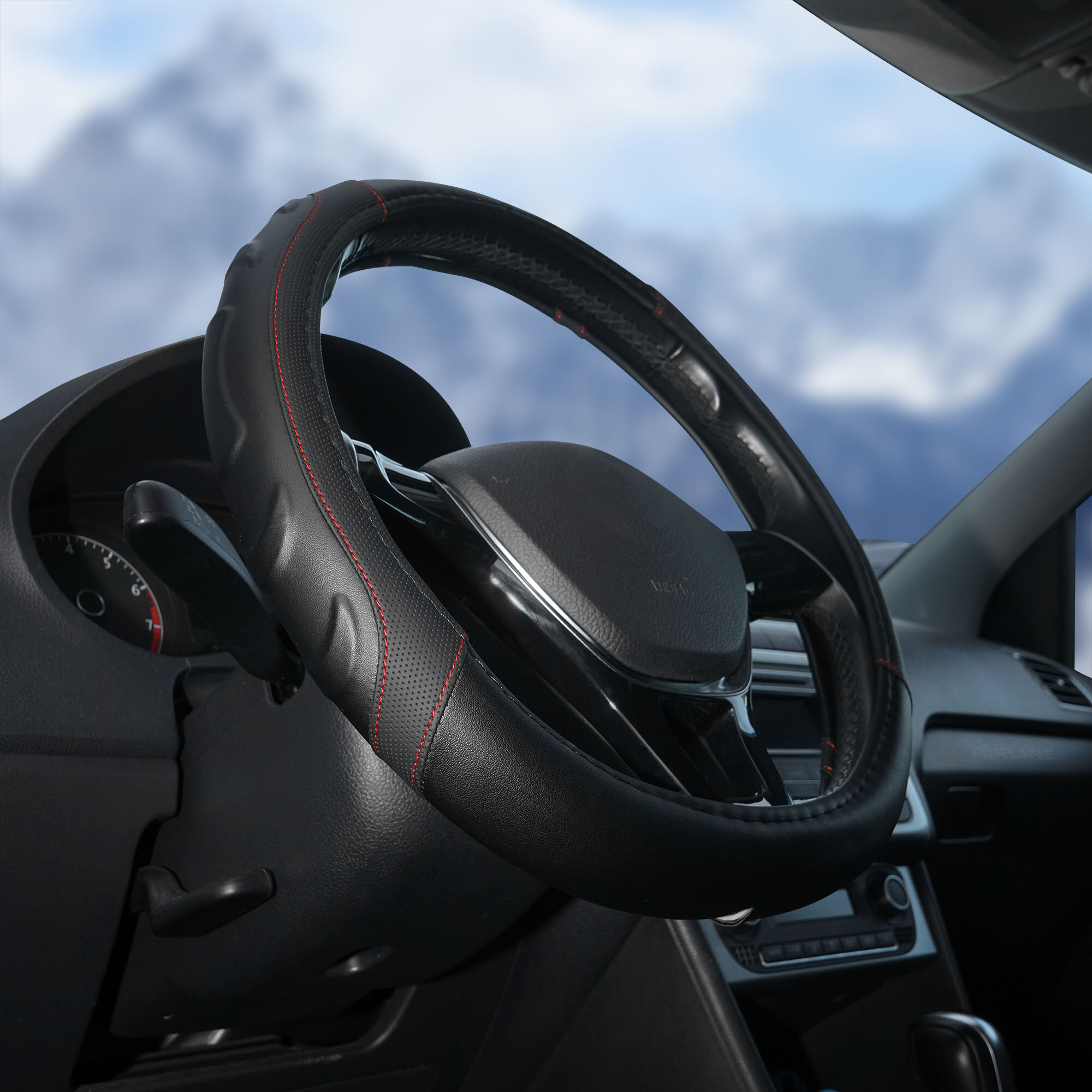 Оплетка на руль Airline M 38 см искусст. кожа рельефная черная с красной прошивкой