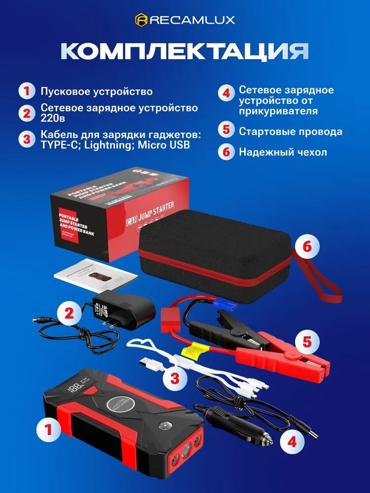 | Комплектация | Пусковое устройство, Сетевое зарядное устройство 220В, Кабель для зарядки гаджетов (Type-C, Lightning, Micro USB), Сетевое зарядное устройство от прикуривателя, Стартовые провода, Чехол |
