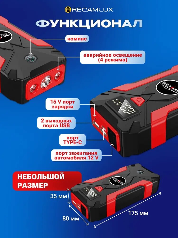 RecamLux / Пусковое зарядное устройство для аккумулятора, бустер автомобильный 29800 мА/ч Jump Starter