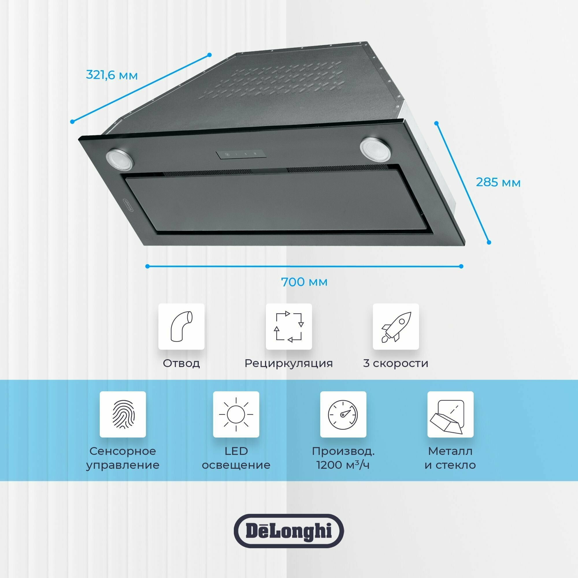Вытяжка для кухни DeLonghi COSETTA 710 NB, черная, 3 скорости, 1200 м3/ч, сенсорное управление, вытяжка кухонная встраиваемая 70 см