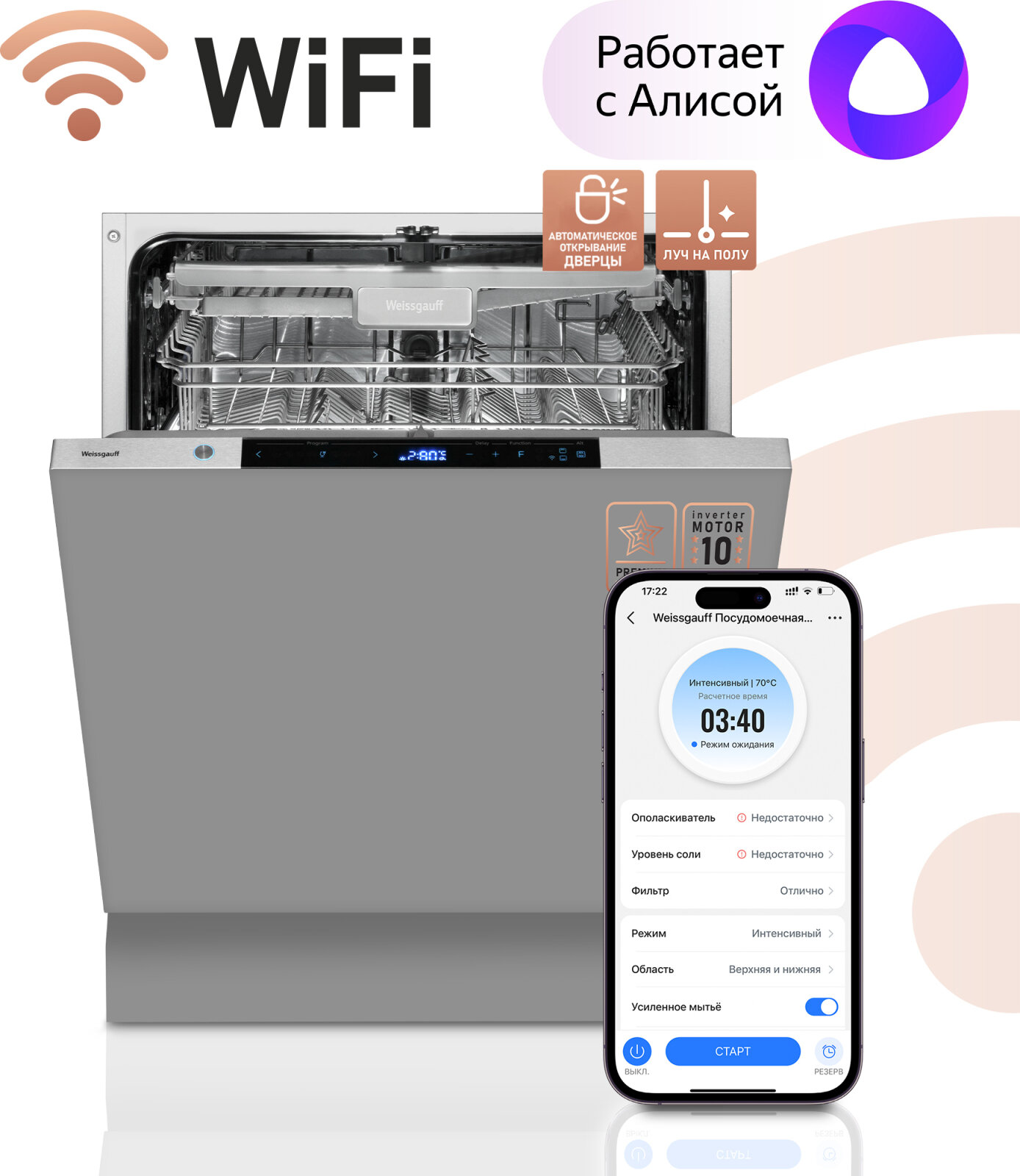 Умная встраиваемая посудомоечная машина с Wi-Fi, лучом на полу, авто-открыванием и инвертором Weissgauff BDW 6150 Touch DC Inverter Wi-Fi (модификация 2024 года),3 года гарантии,3 корзины, 14 комплектов, 8 программ, полная защита от протечек интересное: