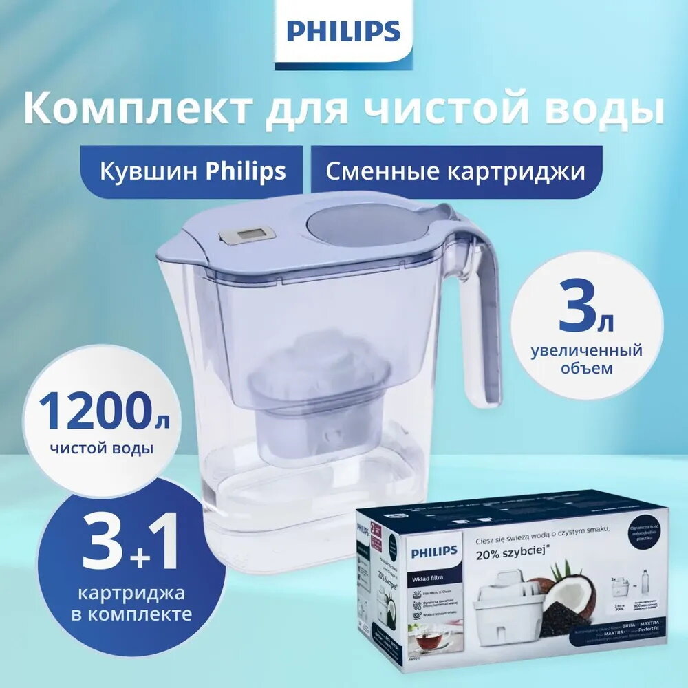 Купить Кувшин для воды Philips AWP2936BLT/51, 3 л + набор картриджей Philips AWP211/51, 3 шт.