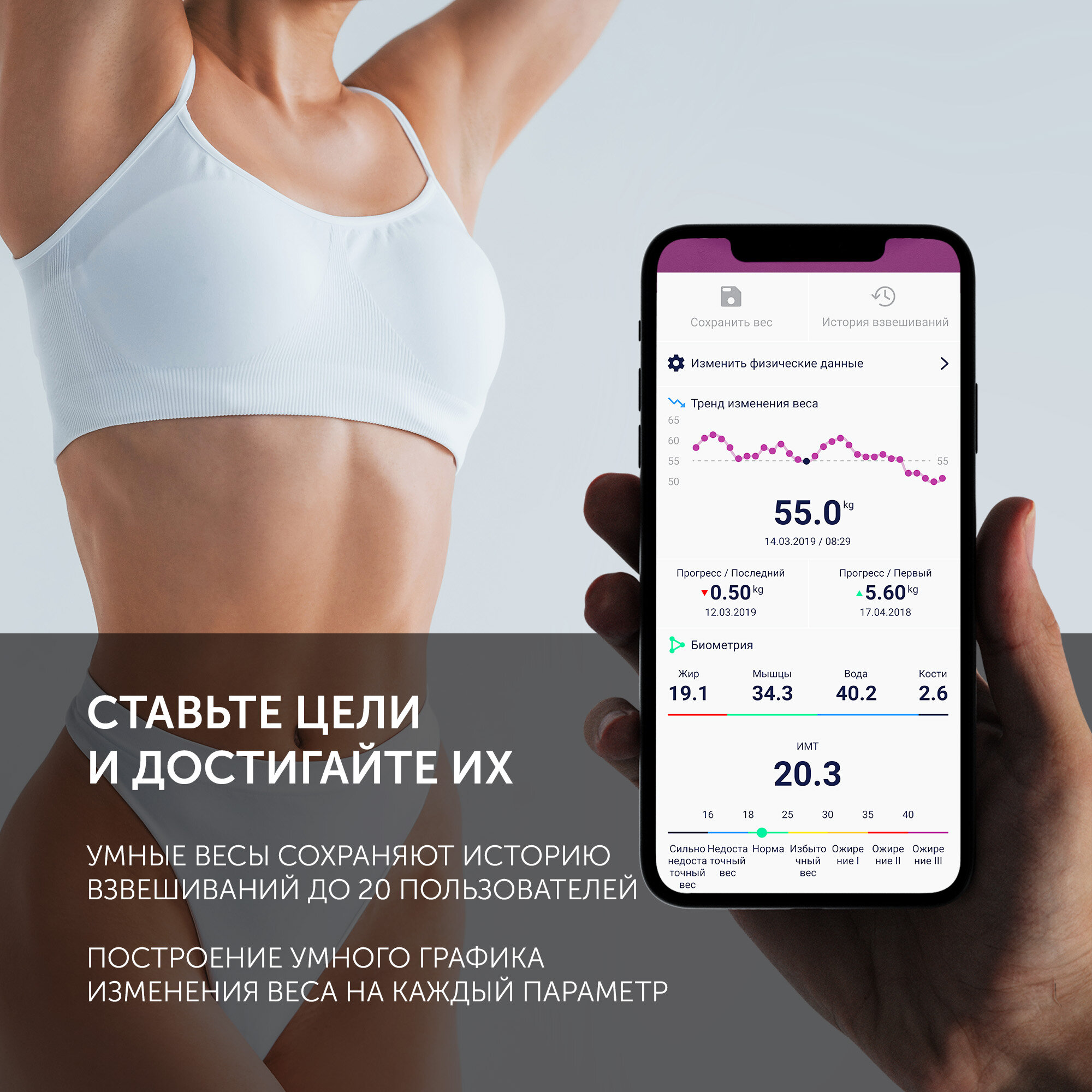 | Дополнительные функции | определение доли воды / определение доли жировой ткани / определение доли костной ткани / определение доли мышечной ткани / память / расчет ИМТ (BMI) |