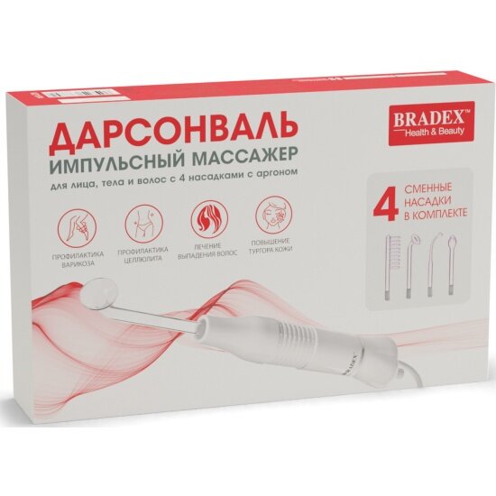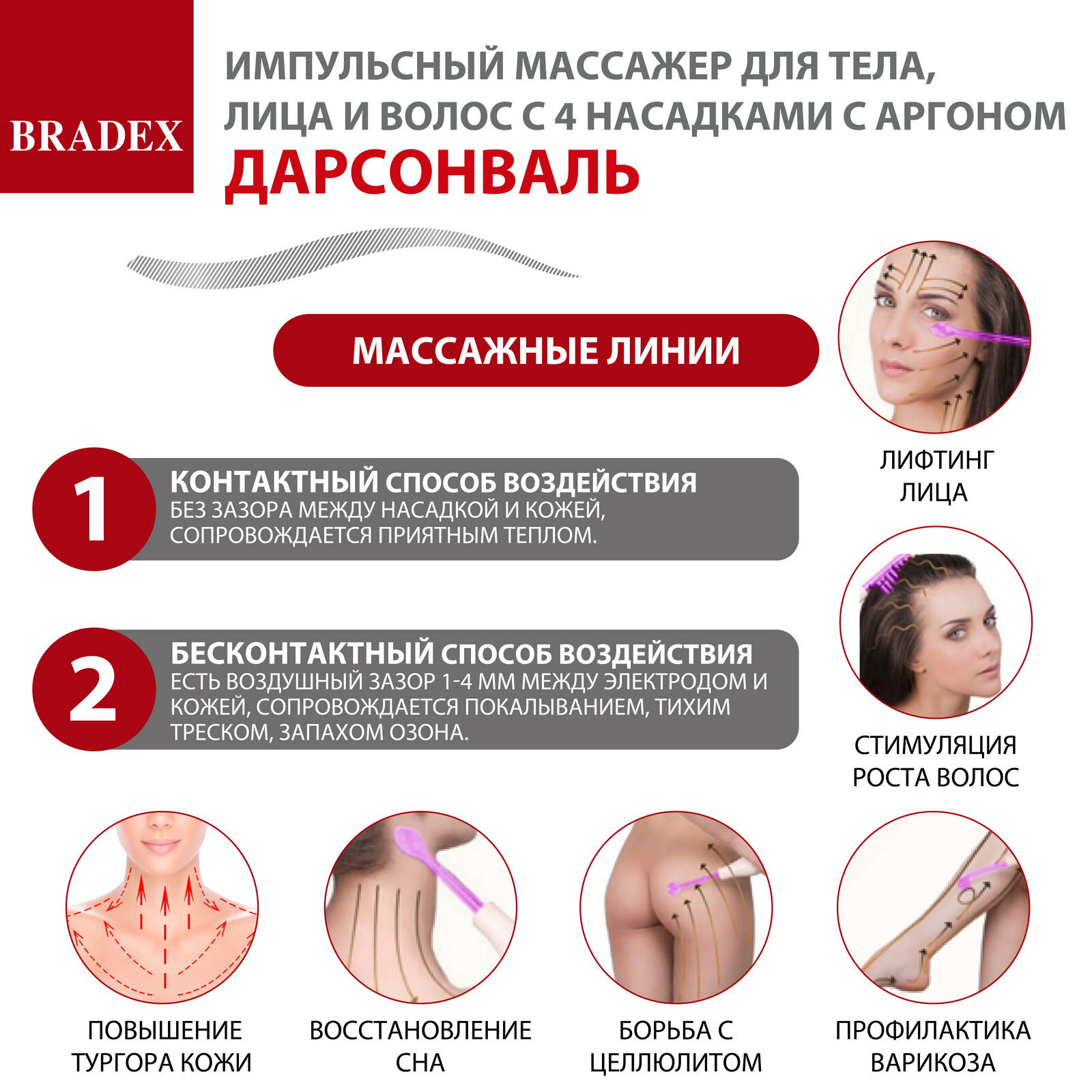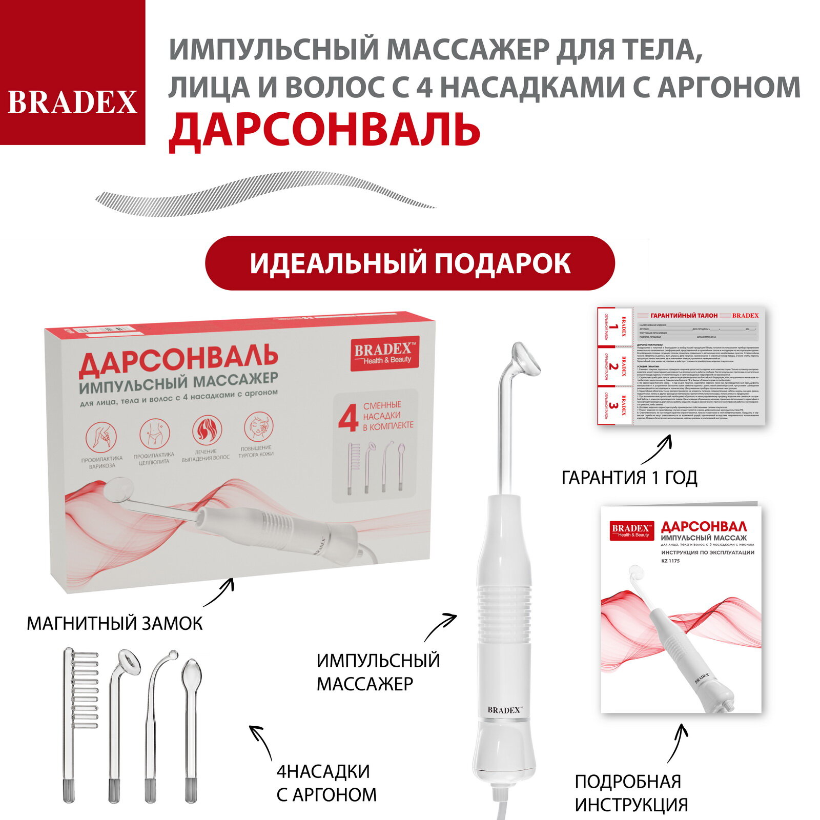 Дарсонваль импульсный массажер Bradex KZ 1174 для лица, тела и волос с 4 насадками с Аргоном, белый . интересное: