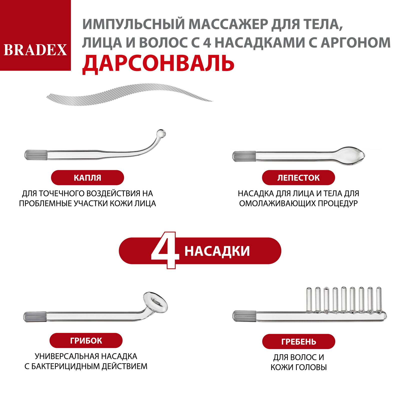 Дарсонваль импульсный массажер Bradex KZ 1174, для лица, тела и волос, с 4 насадками, с Аргоном, белый