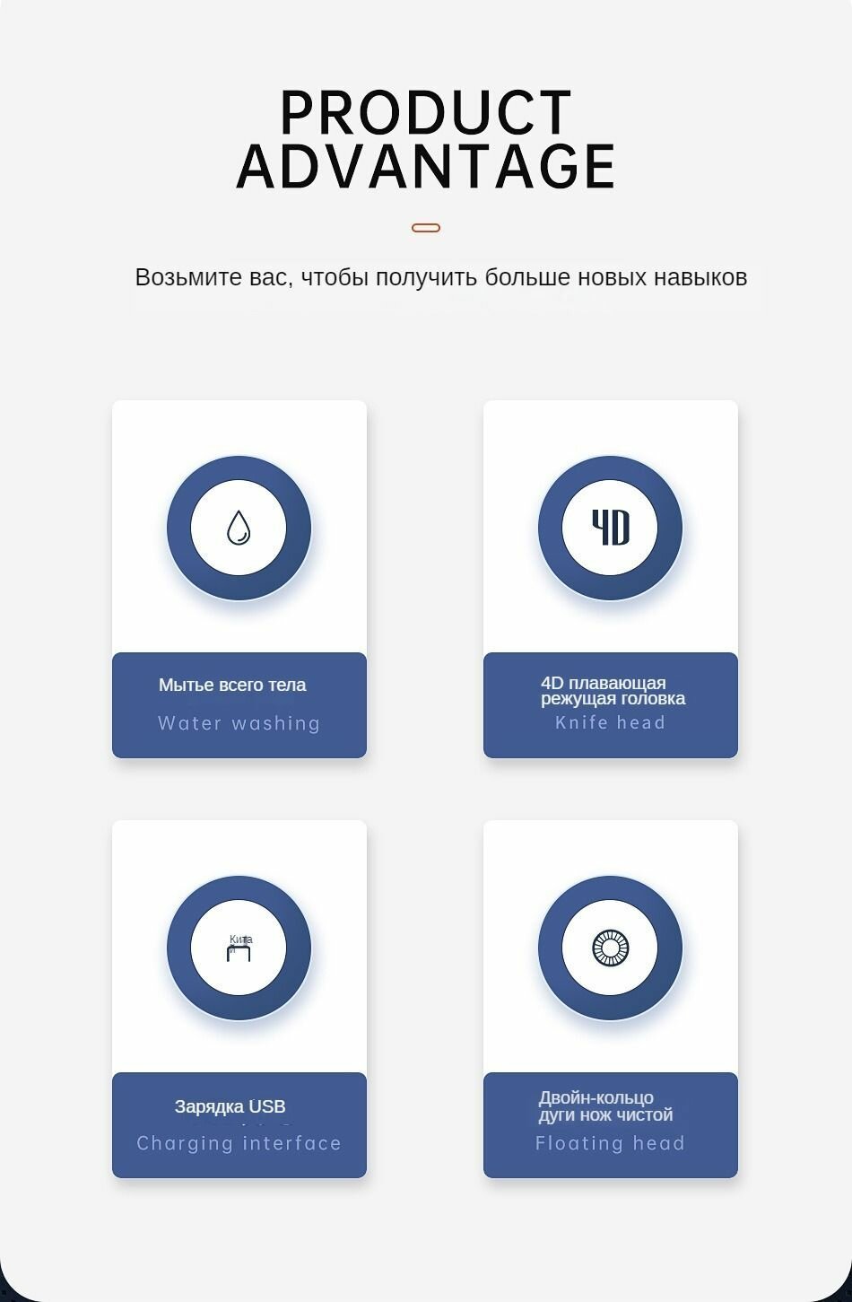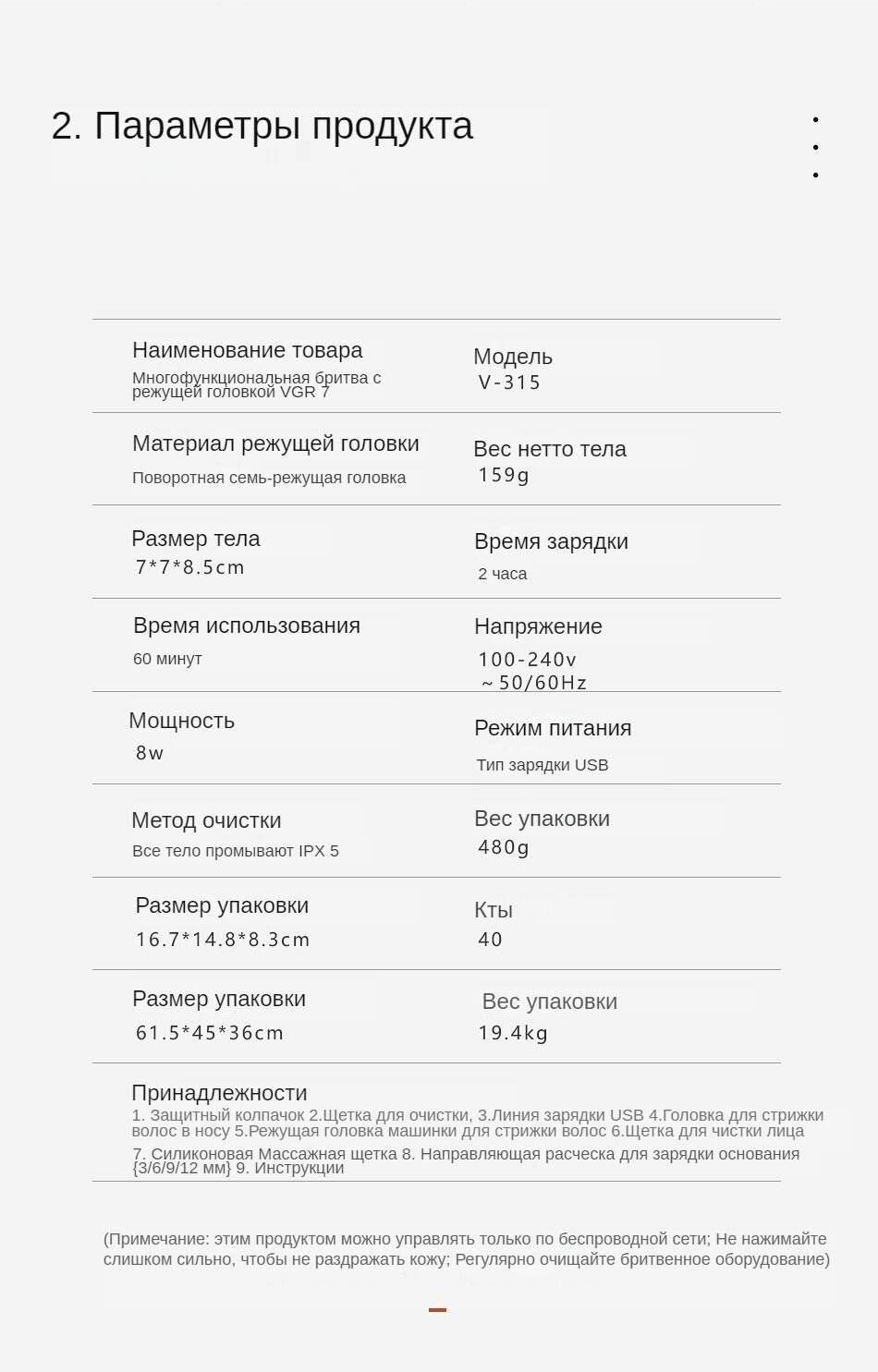 | Подробная комплектация | Защитный колпачок, щеточка для чистки, USB-кабель для зарядки, насадка для триммера волос в носу, насадка для триммера волос, щеточка для чистки лица, силиконовая массажная щеточка, зарядная база, направляющая для стрижки (3/6/9/12 мм), руководство по эксплуатации. |