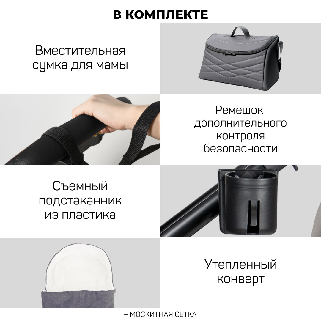 | Комплектация | Вместительная сумка для мамы / ремешок дополнительного контроля безопасности / съемный подстаканник / утепленный конверт / дождевик |