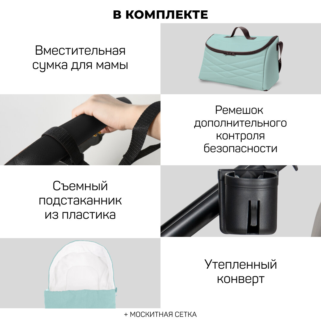 | Комплектация | Вместительная сумка для мамы / ремешок дополнительного контроля безопасности / съемный подстаканник / утепленный конверт / дождевик |
