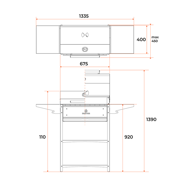 | Дополнительная информация | выдвижной зольник для регулировки интенсивности жара, защита от ветра, контроль температуры с помощью термометра, ширина рабочей зоны 60 см, габариты топки 67 х 39 х 23,3 см |