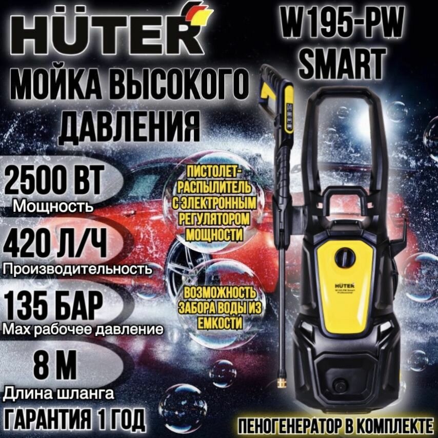 Мойка Huter W195-PW SMART PROFESSIONAL, 2500 Вт, 195 Бар, 420 л/ч, шланг – 8 м, проф. пеногенератор