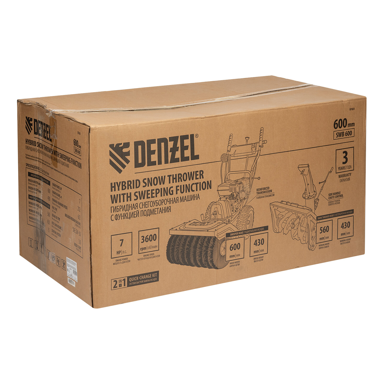 Гибридная снегоуборочная машина с функцией подметания Denzel SWB-600, 212 сс, руч. старт, 2 насадки 97661
