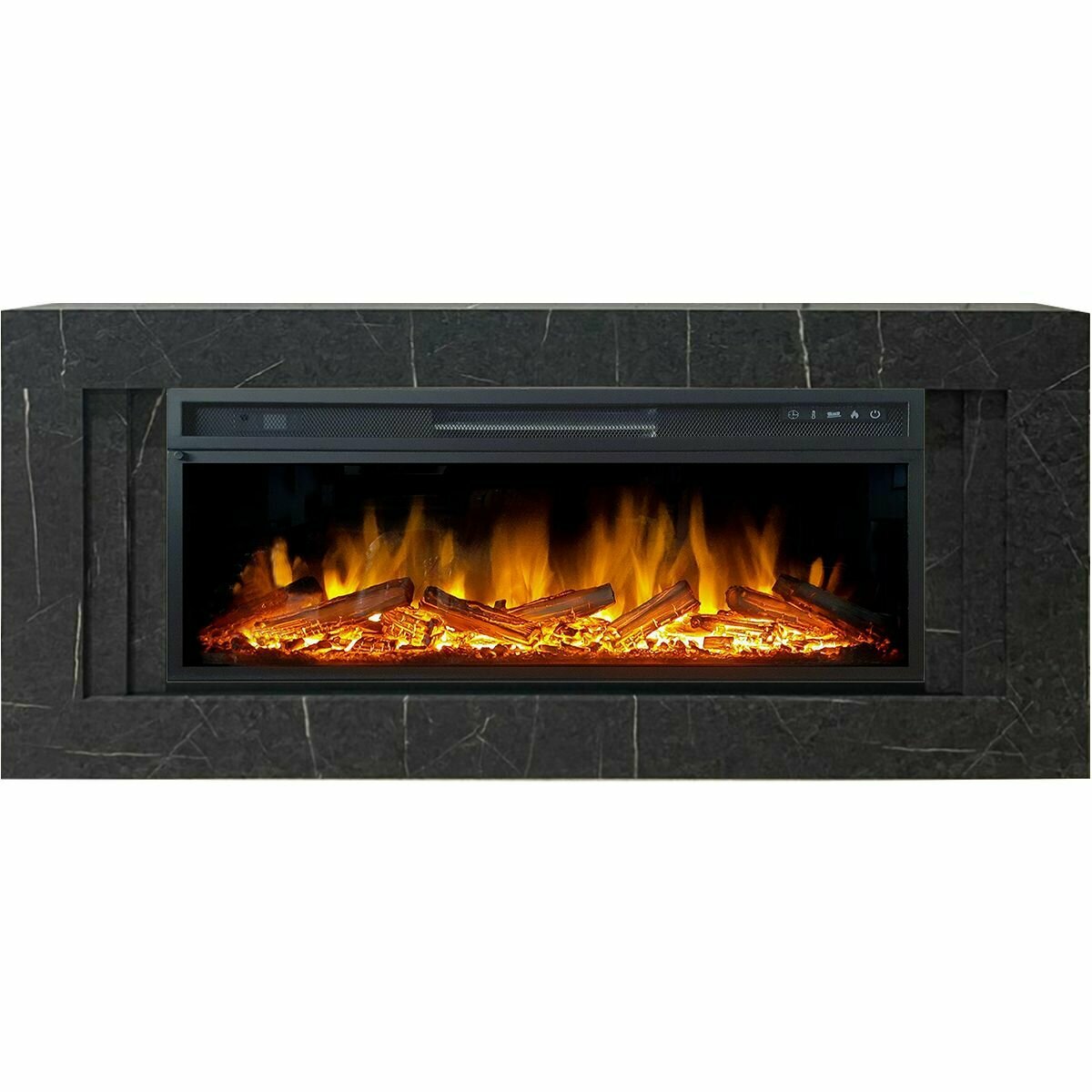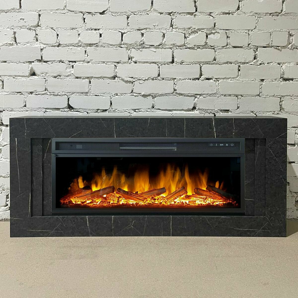 Купить Линейный электрокамин FlameKamin Лайн GR-MR серый мрамор с очагом Vision 42 LOG LED, дрова, обогрев, пульт ДУ (линейный электрический камин)