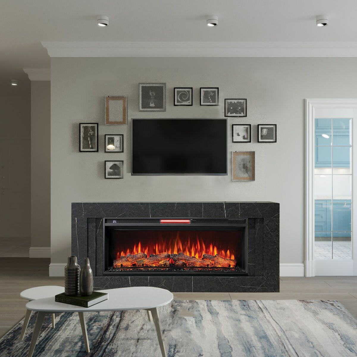 Линейный электрокамин FlameKamin Лайн GR-MR серый мрамор с очагом Vision 42 LOG LED, дрова, обогрев, пульт ДУ (линейный электрический камин)