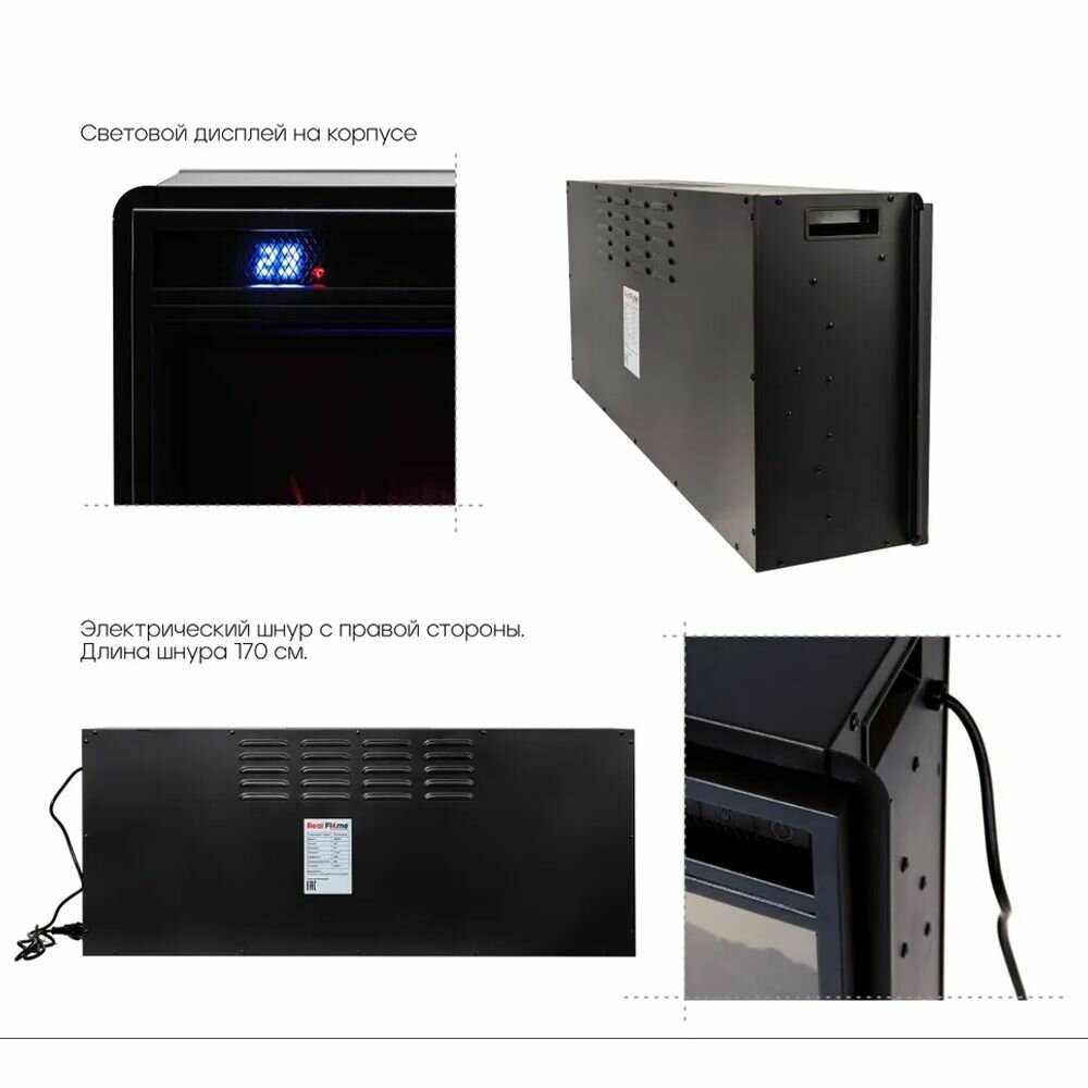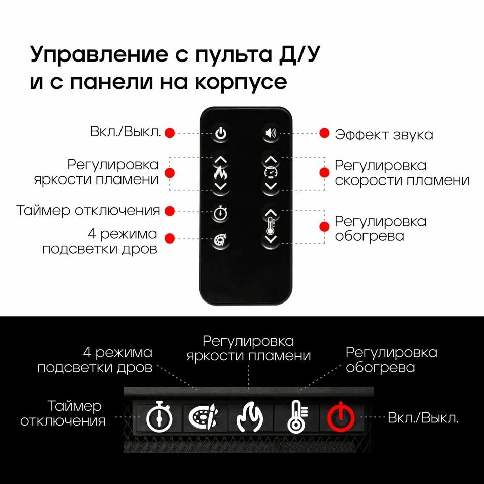 | Дополнительная информация | Имитация пламени, Пульт ДУ, Регулировка высоты, Режим работы без нагрева, Таймер, Термостат, Информационный дисплей |