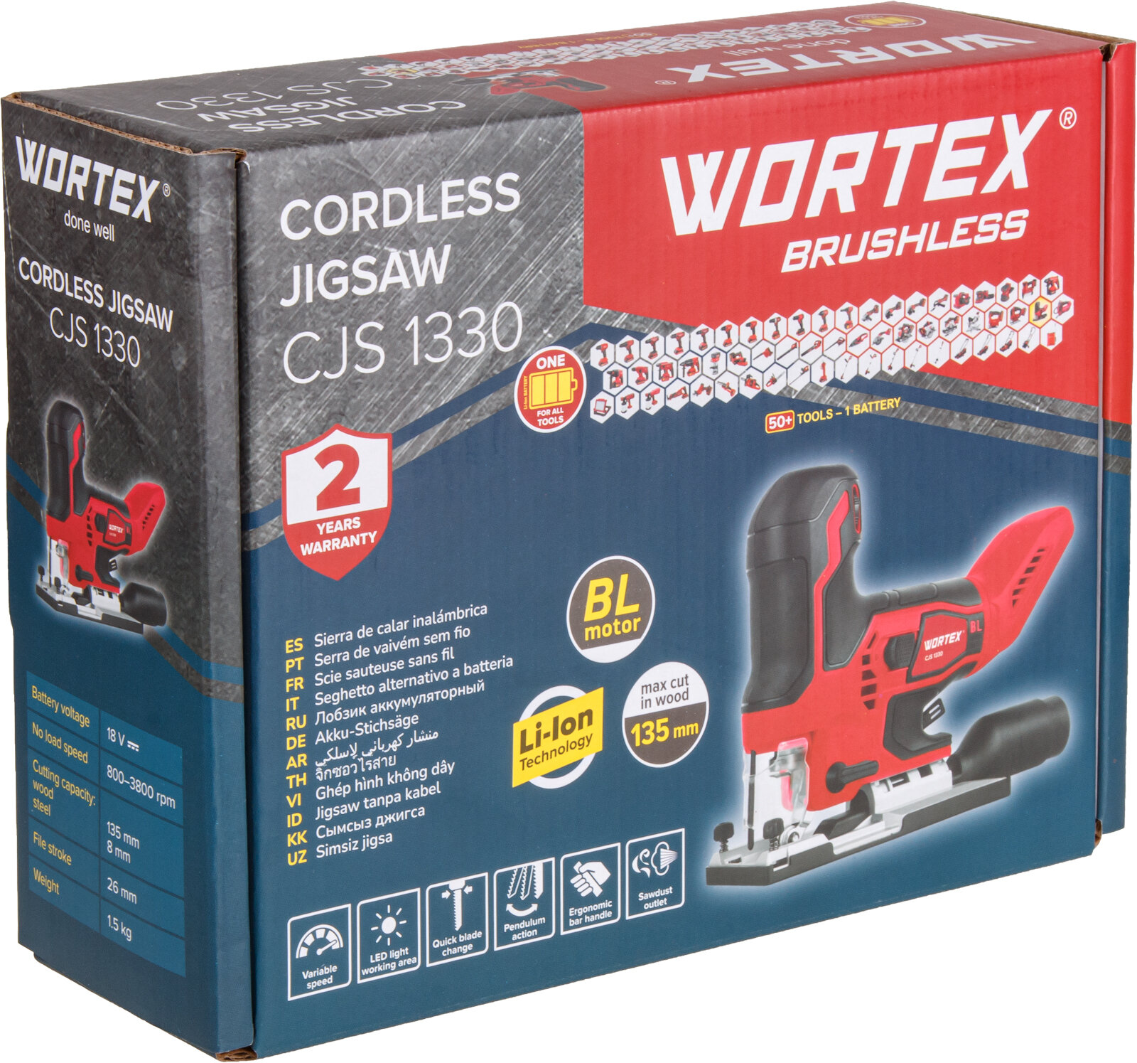 Аккум. лобзик WORTEX CJS 1330 в чем. ALL1 мега акция бесщёт, 18В, 800 - 3800 ход/мин, пропил до 130 (1325401)