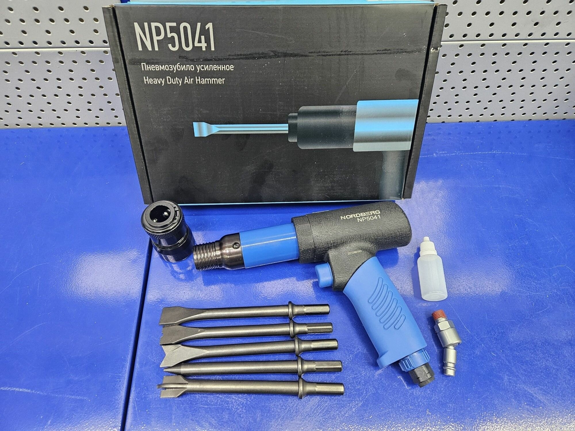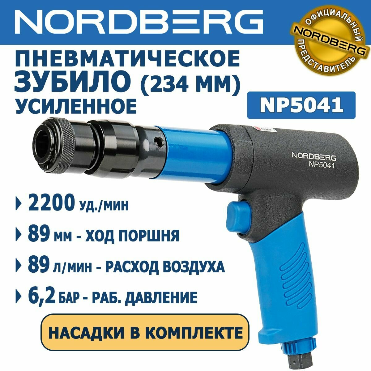 Пневматическое зубило 234 мм NORDBERG NP5041, комплект насадок, быстросъёмный держатель, усиленный корпус, 2200 ударов/мин, ход поршня 89 мм, расход воздуха 89 л/мин, интересное: