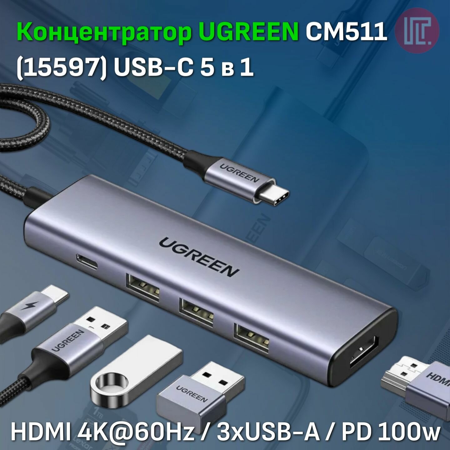 СохранитьХаб USB-C 5 в 1 UGREEN CM511 / HDMI 4К 60Гц / 3хUSB-A 3.0 / PD зарядка 100Вт / цвет серый космос (15597) интересное: