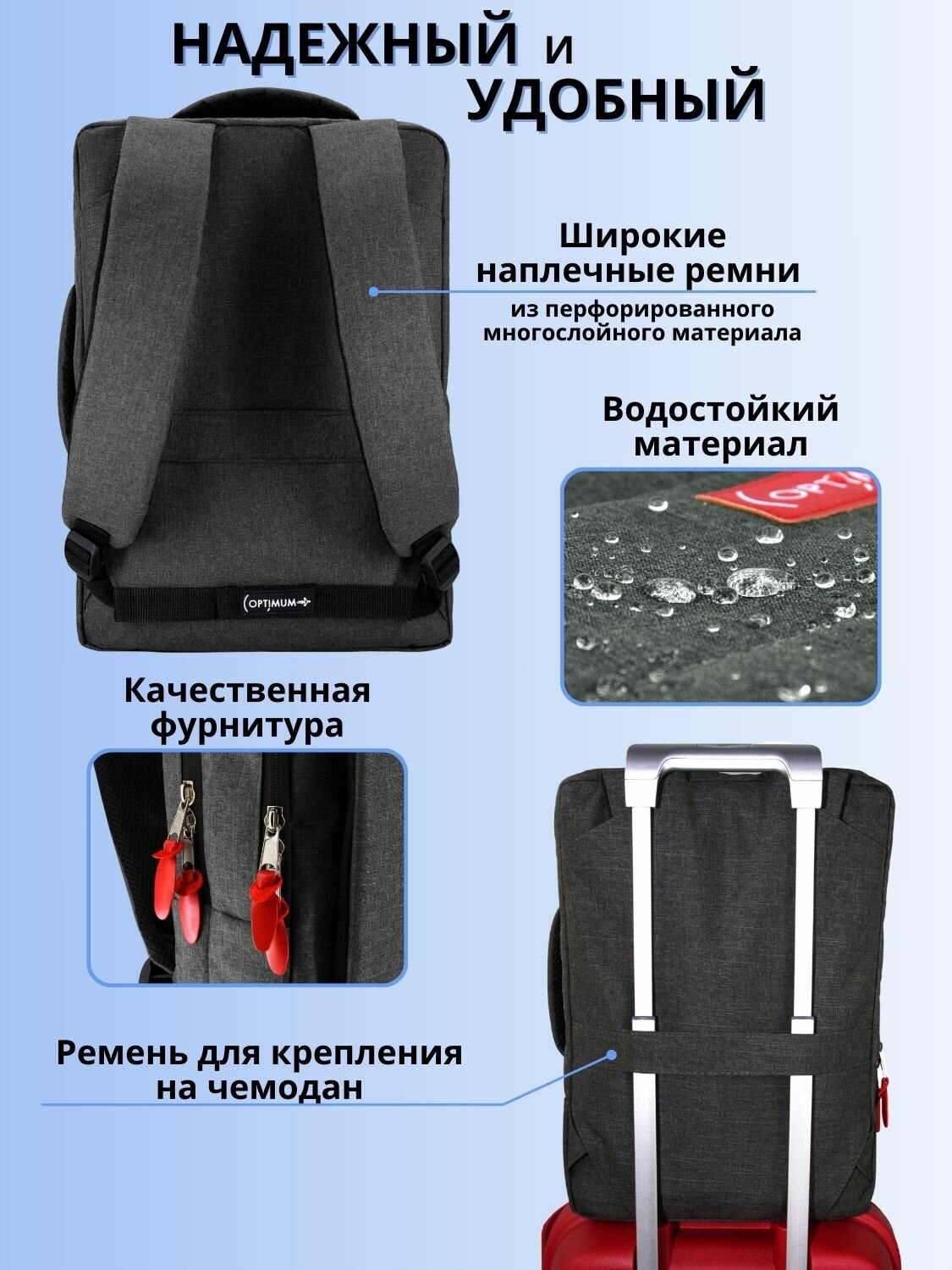 | Особенности | внешний карман, возможность крепления на тележку, защита от воды, карман для телефона, отделение-органайзер |