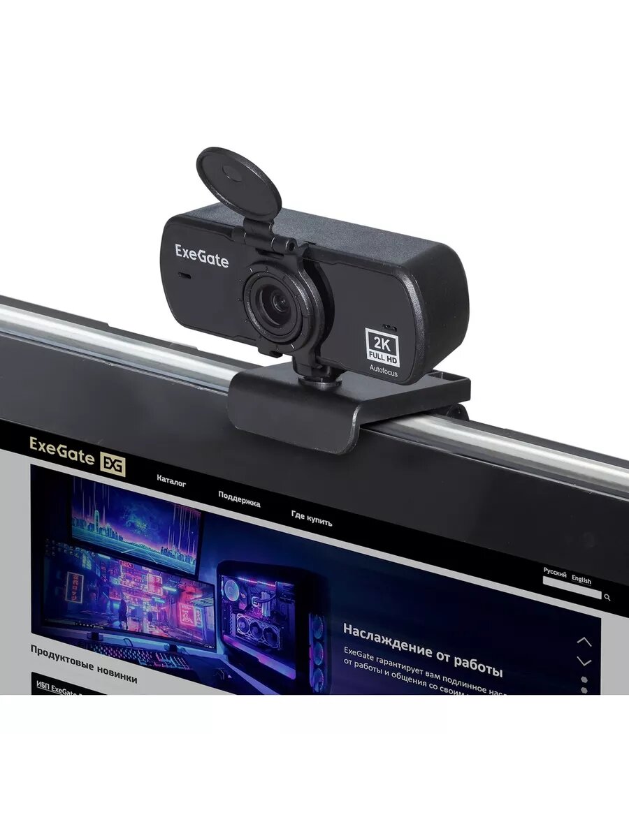 Веб-камера широкоугольная ExeGate Stream C940 Wide 2K T-Tripod (матрица 1/3" 4 Мп, 2560x1440, 30fps, широкоугольный 4-линзовый (стекло) объектив 89°, USB, автоматический фокус, микрофон с шумоподавлением, защитная шторка, универсальное крепление, штатив T