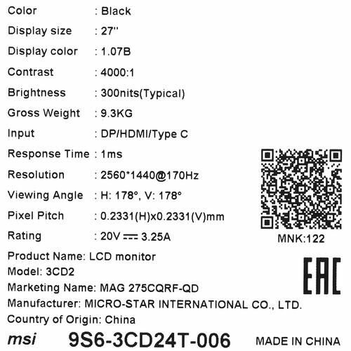 Монитор MSI MAG 275CQRF QD 27", черный [9s6-3cd24t-006]
