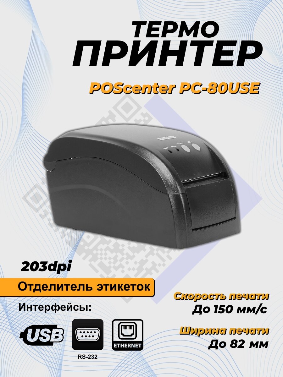 Принтер этикеток Poscenter PC-80USE (термо, 203dpi, USB, Ethernet, RS232) черный (126577)