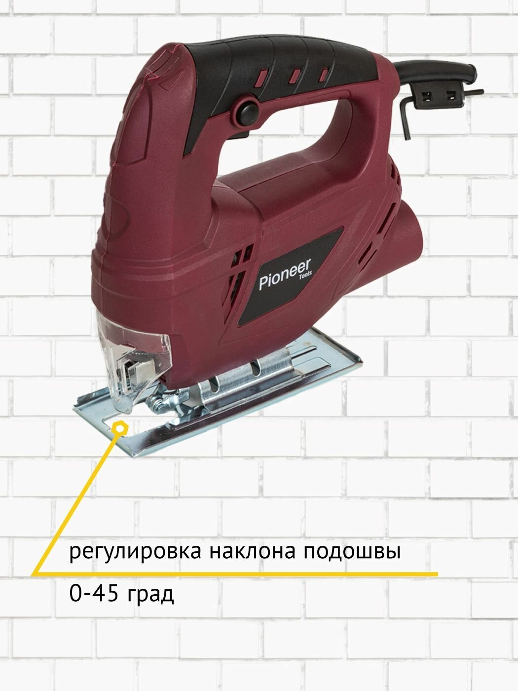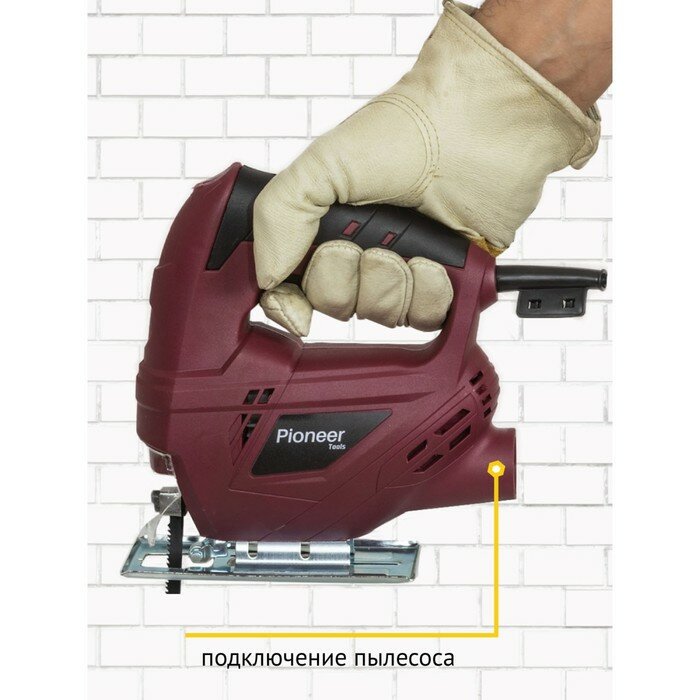 Лобзик электрический Pioneer с щеточным двигателем и защитным экраном, возможность подключения пылесоса, фиксация скорости