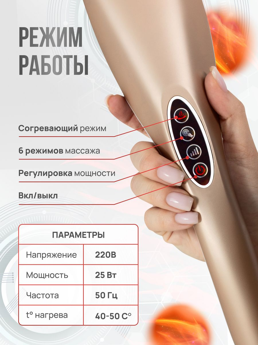 | Зона массажа | бедра / голени / грудная клетка / декольте / живот / ноги / плечи / поясница / пресс / руки / спина / стопы / талия / тело / шея / ягодицы |