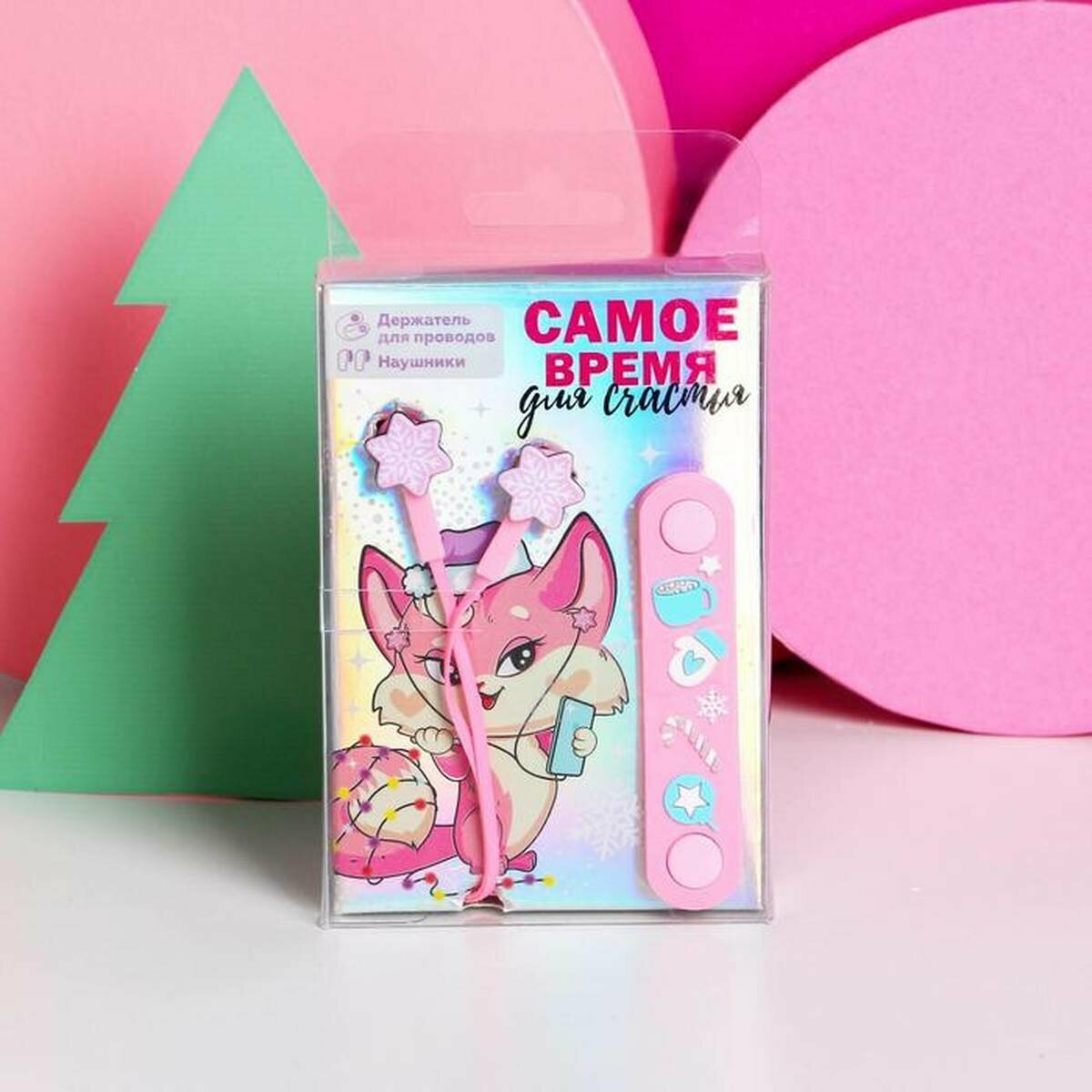 Новогодний подарочный набор, наушники и держатель для проводов "Время для счастья",микрофон, 1.2 м