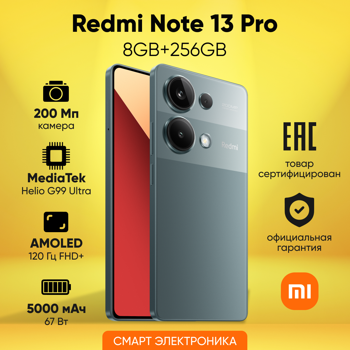 Смартфон Xiaomi Redmi Note 13 Pro 8+256 N6/Forest Green 6.67 FHD+/AMOLED/120 Hz/MTK G99 Ultra/And13/200+8+2/16MP/NFC/5000mAh