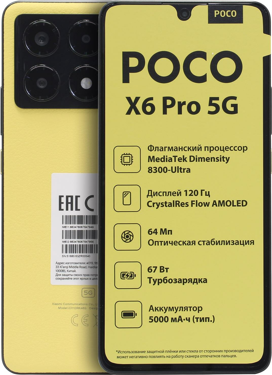 | Заводская комплектация | смартфон POCO X6 Pro, защитный чехол, зарядный блок питания, кабель зарядки, документация |