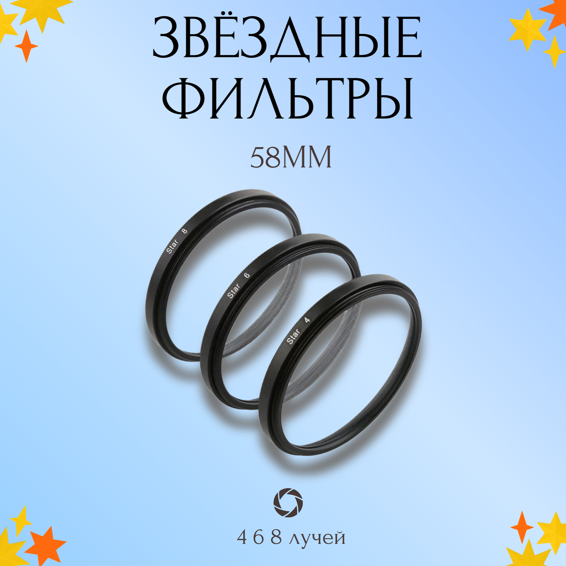 Купить Набор звездных фильтров 58мм (Star 4 + 6 + 8) / Лучевые светофильтры для объектива