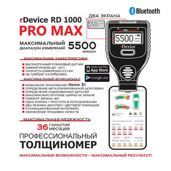Толщиномер rDevice RD-1000 PRO MAX, два экрана (максимальные функции)