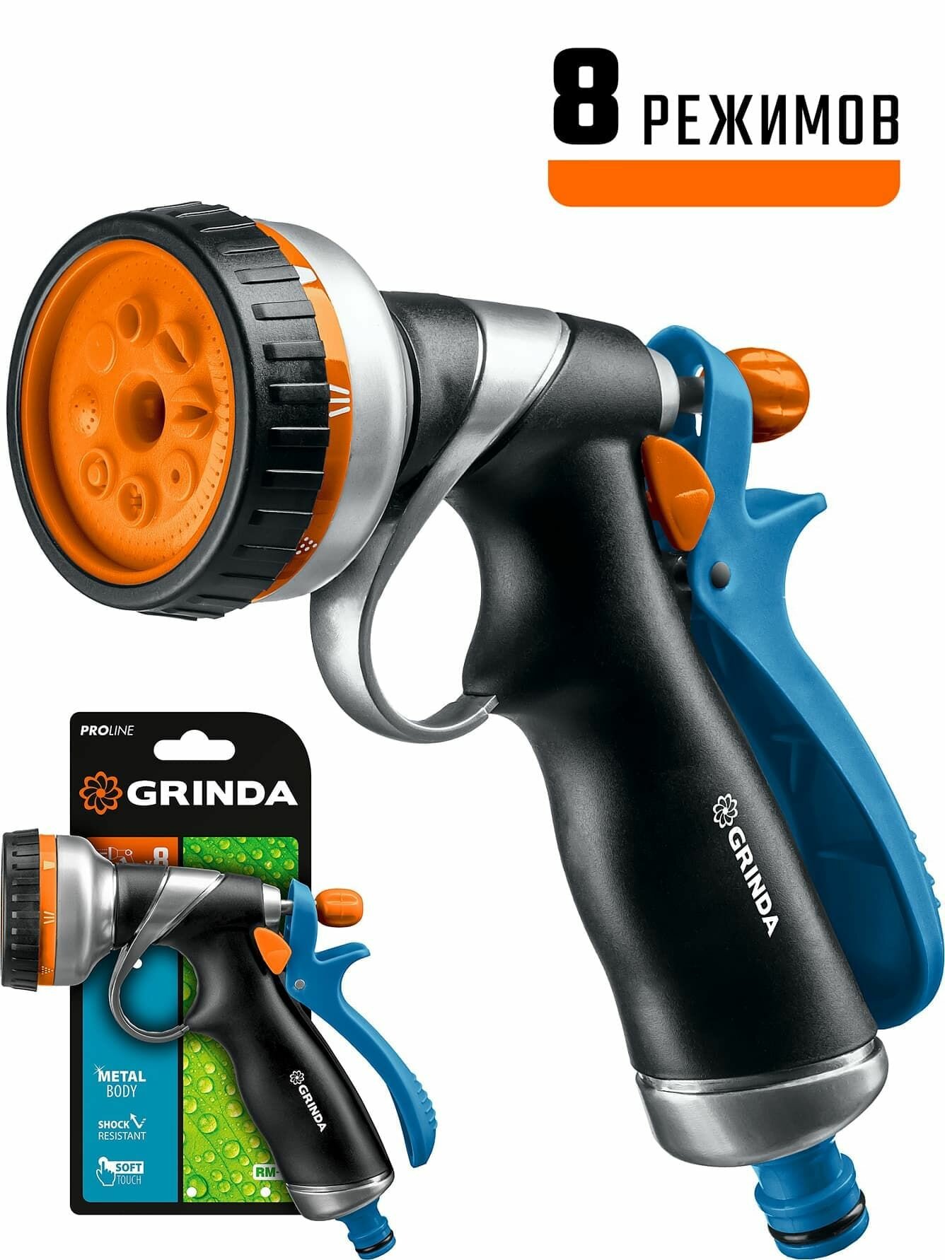 Пистолет-распылитель Grinda поливочный PROLine RM-8, 8 режимов, курок сзади, металлический с TPR