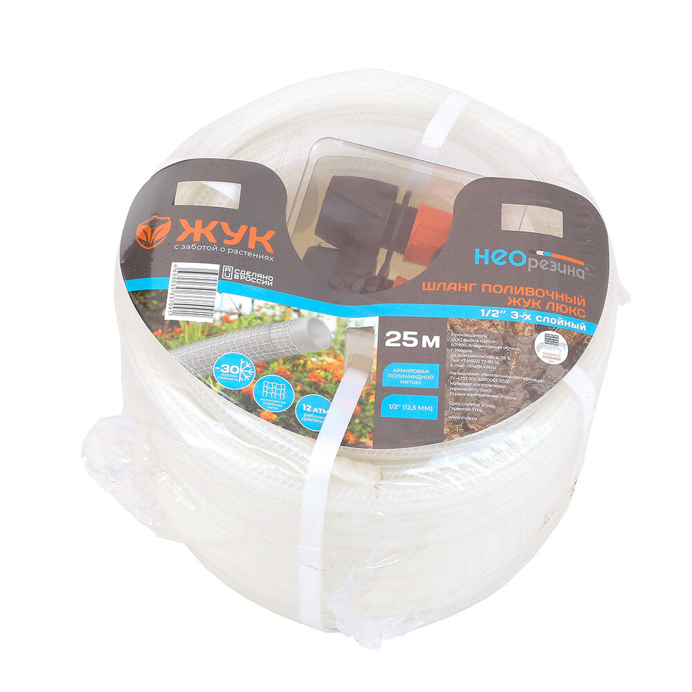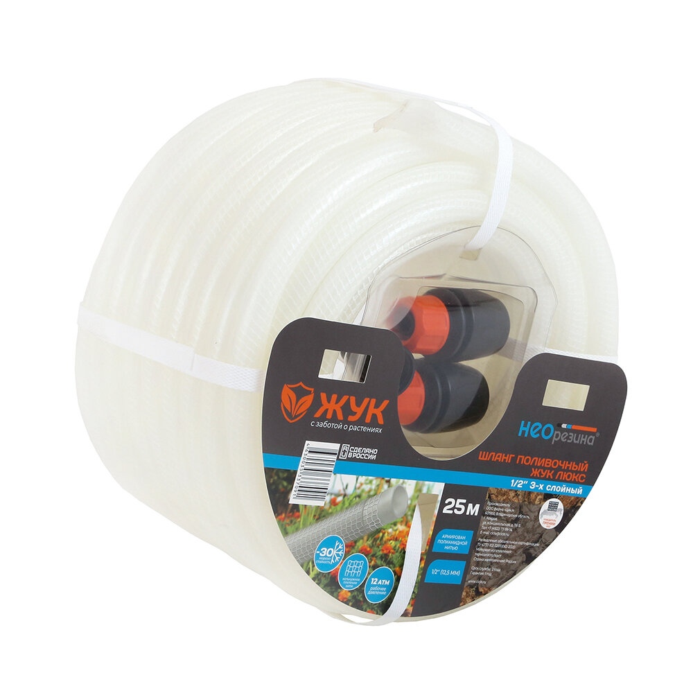 Шланг поливочный садовый 1/2 25 м армированный трехслойный, диаметр 12.5 мм, Жук интересное:
